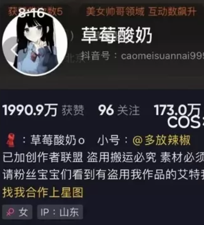 抖音草莓酸奶抖音号:caomeisuannai999,IP属地:山东,小号是@多放辣椒,微博@草莓酸奶o(内容清空, 不过之前给大家备份下来了相册),新微博@是草莓酸奶o(疑似,慎重!)